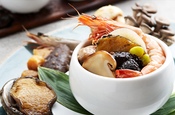 將魚翅、海參、野生松茸、烏骨雞、鮑魚等15種珍貴頂級食材一併放入甕形容器中,然後蒸3至4小時後,即成一道極品好滋味的山珍海味滋補佳餚。