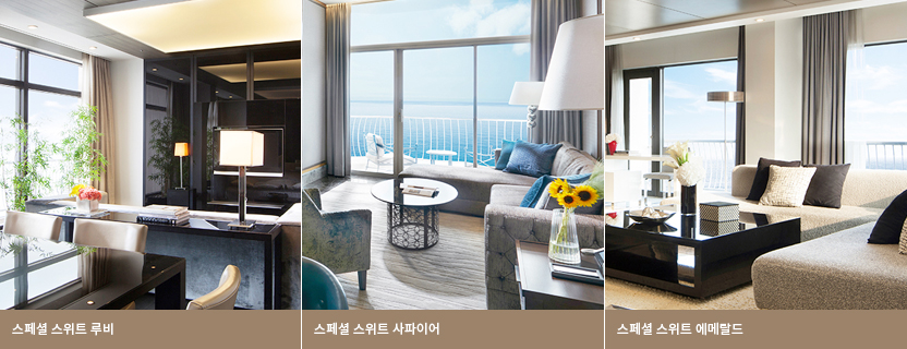 스페셜 스위트 : 루비 동양적인 안정감과 신비로운 느낌을 함께 느끼실 수 있습니다. 스페셜 스위트 : 사파이어 은은한 화려함과 절제된 선의 사용으로 고급스러운 중후함을 느낄 수 있습니다. 스페셜 스위트 : 에메랄드 감각적인 디자인과 바다가 어우러지는 유니크하고 세련된 감성의 스위트룸입니다.