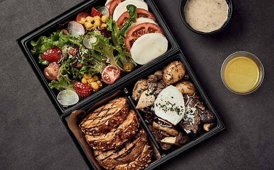 양송이와 표고, 새송이 버섯과 소 살치살을 트러플 풍미로 조리해 고급스러운 맛을 더했습니다. 토핑한 수란을 터트려 더욱 고소하게 즐겨보세요! 신선한 모짜렐라치즈와 토마토의 카프레제, 다양한 채소, 구운 건강 빵을 곁들여 다채롭고 풍성한 맛을 선사합니다.