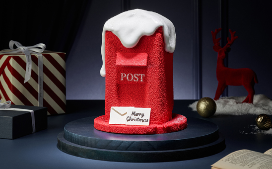 다크 초콜렛과 체리를 첨가한 휘낭시에 시트 위에 한 겨울의 눈이 소복하게 쌓인 우체통 케이크
