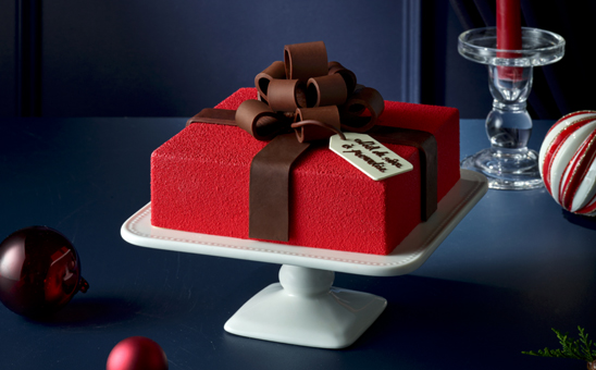 크림 치즈와 다크 초콜렛 무스, 베리 콤포트로 만든 상자를 초콜렛으로 만든 리본이 감싸고 있는 케이크