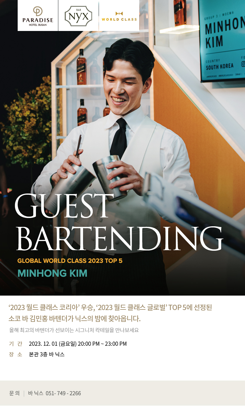 ‘2023 월드 클래스 코리아’ 우승, ‘2023 월드 클래스 글로벌’ TOP 5에 선정된 소코 바 김민홍 바텐더가 닉스의 밤에 찾아옵니다.