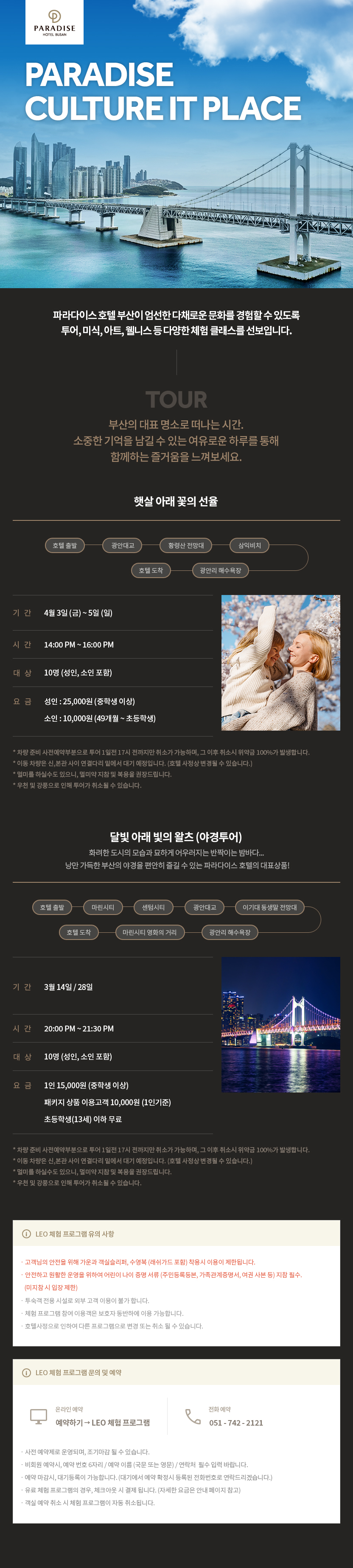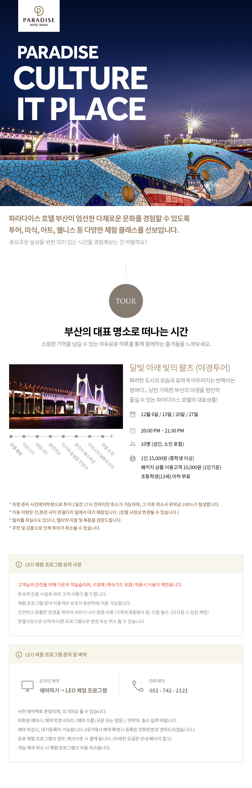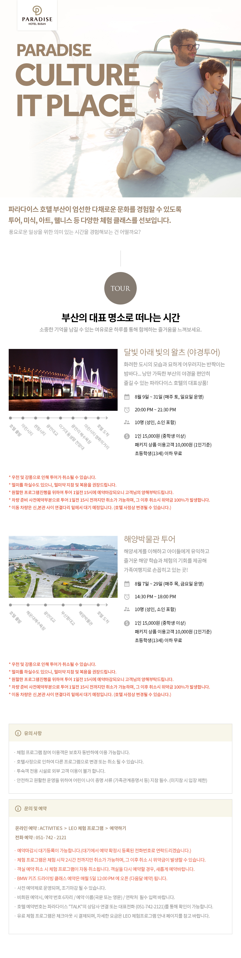 파라다이스 호텔 부산이 엄선한 다채로운 문화를 경험할 수 있도록 투어, 미식, 아트, 웰니스 등 다양한 체험 클래스를 선보입니다.