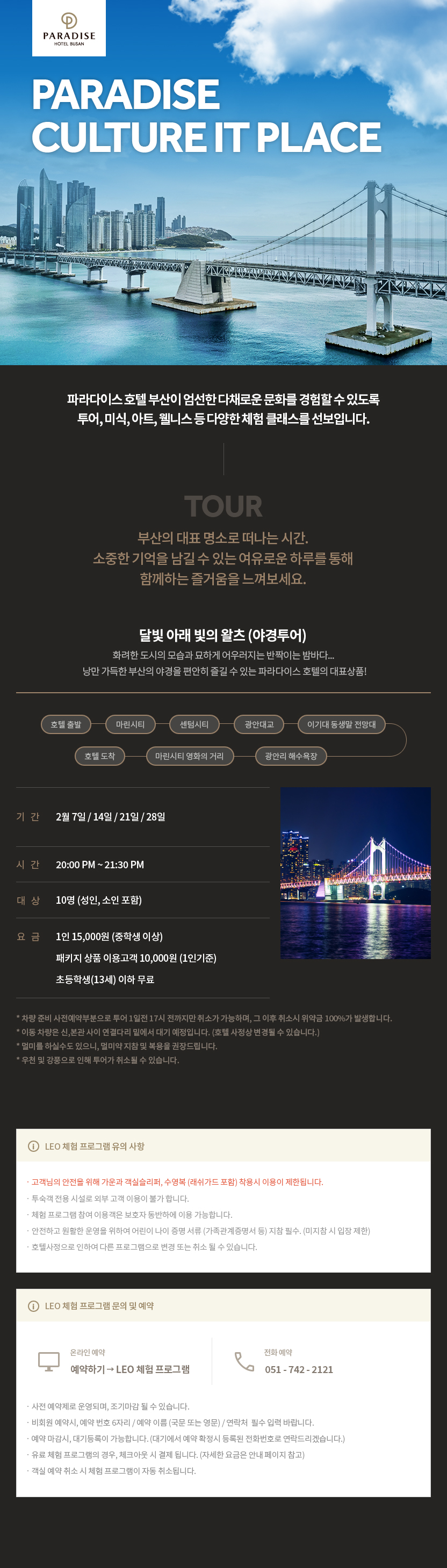 파라다이스 호텔 부산이 엄선한 다채로운 문화를 경험할 수 있도록 투어, 미식, 아트, 웰니스 등 다양한 체험 클래스를 선보입니다.