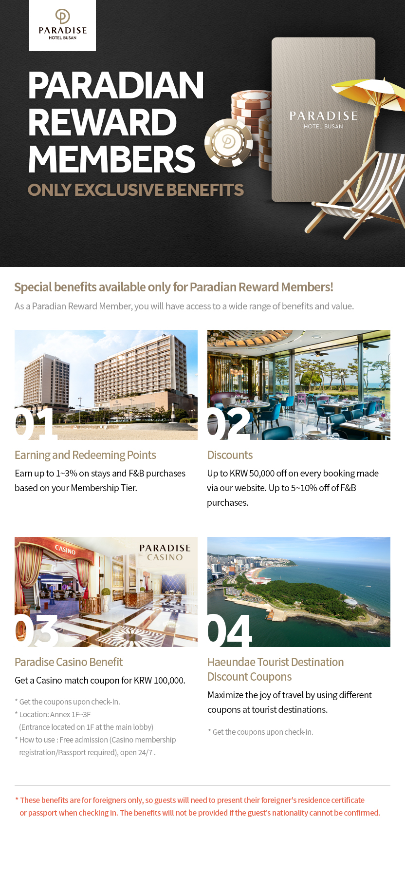 파라다이스 리워즈 멤버십 회원이 되시면 더 많은 혜택을 누리실 수 있습니다.