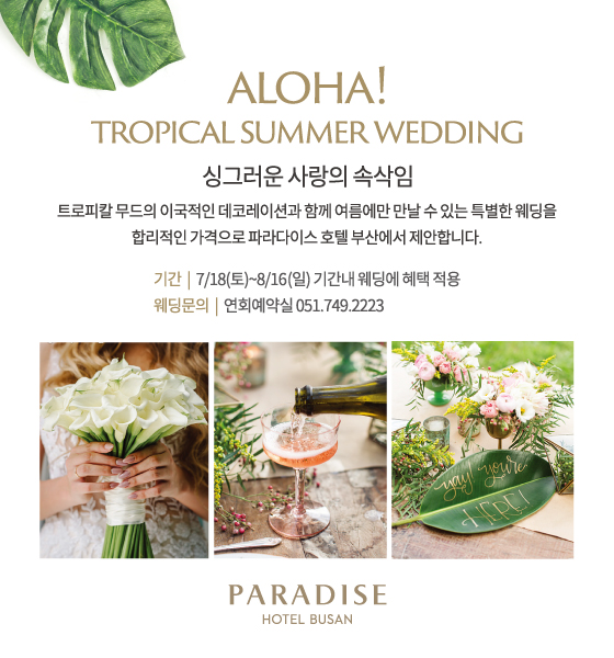 美しく輝く思い出として心に刻まれる祝福の瞬間、最高の眺望が広がる海雲台の海の風景にふさわしいワンランク上の特別な雰囲気。ウェディングのスペシャリストたちと創り上げる、お客様のスタイルに合わせた品のあるウェディングプランで、世界で一つだけのオリジナルウェディングを華やかに演出します。最高級のサービスと盛大なスケールのBlack Lable、プライベートでアットホームなウェディングに適したVintage Label。いつまでも美しく思い出に残る、世界で一つだけのウェディングをパラダイスホテル釜山がお手伝いいたします。