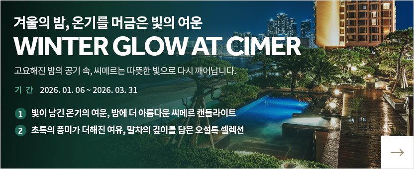 위치 : 본관 4층 계절에 따라 테마 Bath 는 변경됩니다. 오션스파 '씨메르' & 야외 오션스파 풀 (수영장) 이용 시, 안전사고 예방을 위해 개별 아쿠아슈즈 또는 슬리퍼를 지참하여 주시기 바랍니다. 수모 또는 모자는 착용하지 않아도 됩니다.