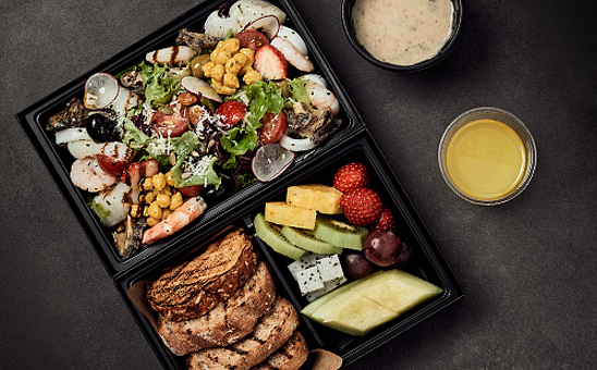 구성해산물 샐러드 (가리비, 문어, 전복, 한치,새우, 그린홍합, 올리브, 병아리 콩, 레디쉬, 파마산 치즈), 건강 빵, 계절과일 5~6종, 드레싱(유자, 발사믹)